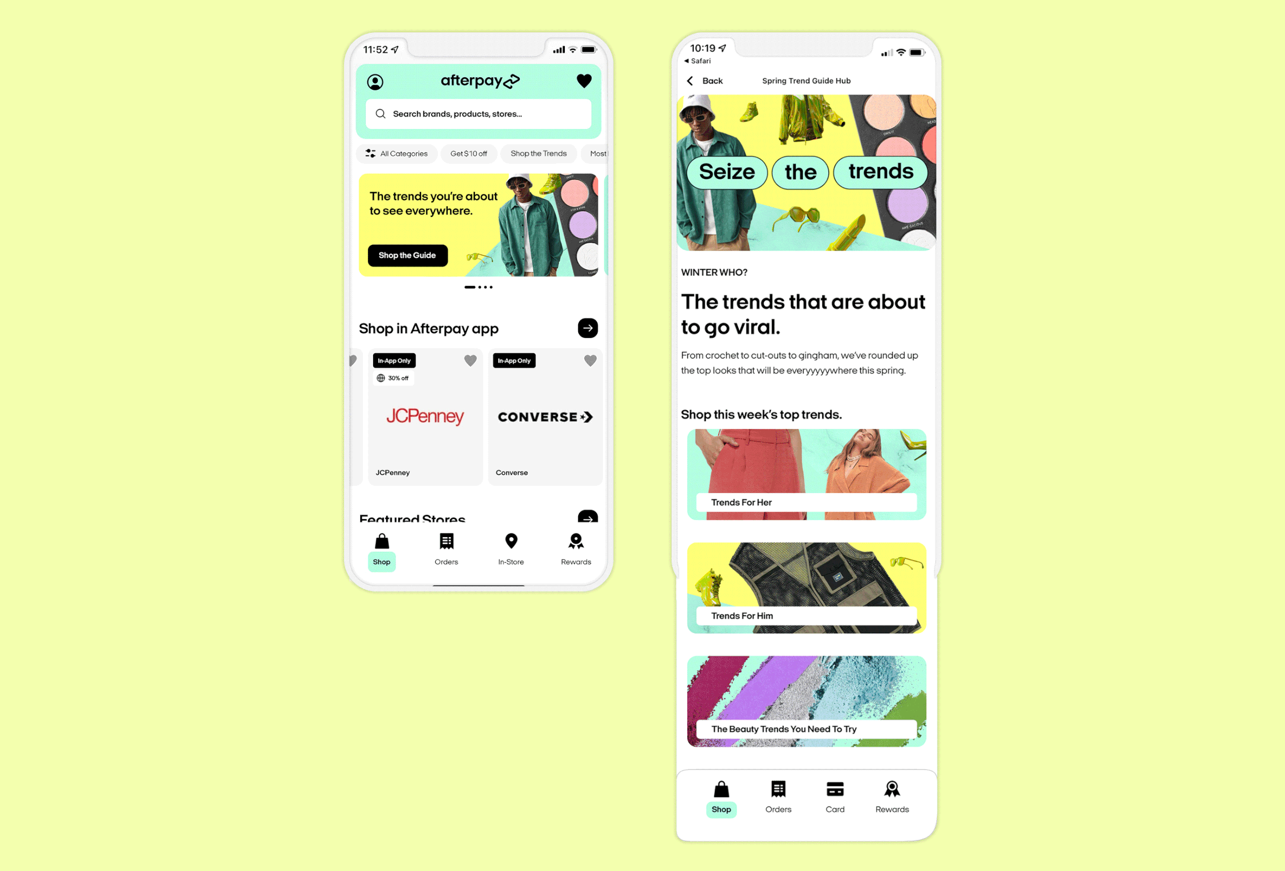 An app-based hub for all things trending spring that ran alongside the Afterpay Day Carte Diem Event. Each of the three overarching categories featured key pieces with accompanying styling guides, all of which were shoppable within the app. I was responsible for design, include cross-platform promotional pieces.