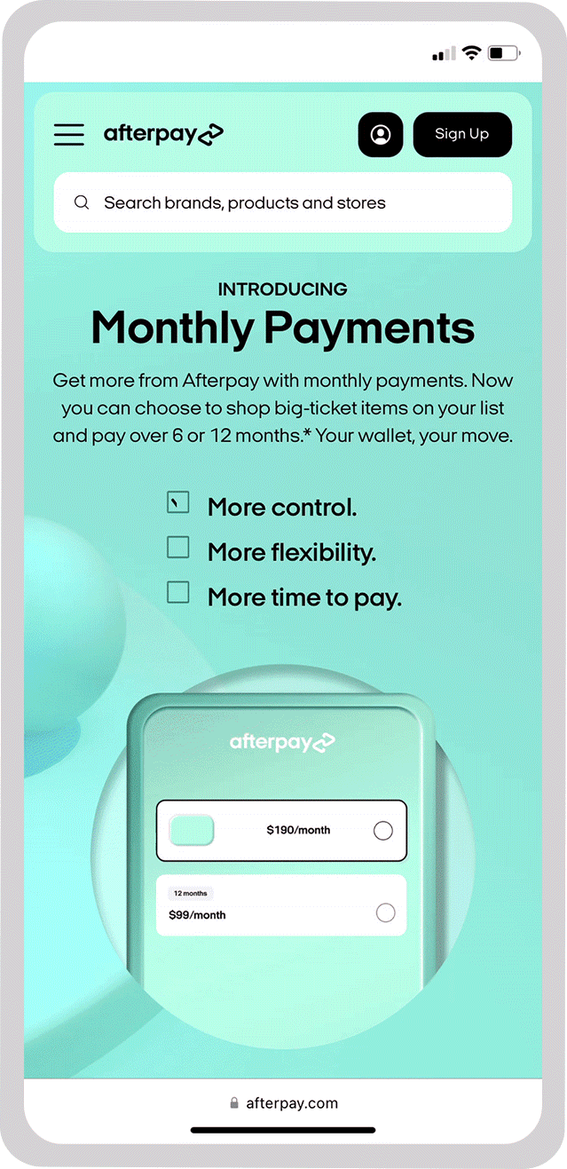 In September 2022, Afterpay launched a new payment option allowing users to spread their payments over 6 or 12 months, a major change from the previous Pay in 4-only model. This new offering gives Afterpay shoppers in the US even more flexibility in choosing a payment option that fits their budgets. In partnership with the product team and creative leadership, I designed the page and comms announcing and outlining this new payment option.