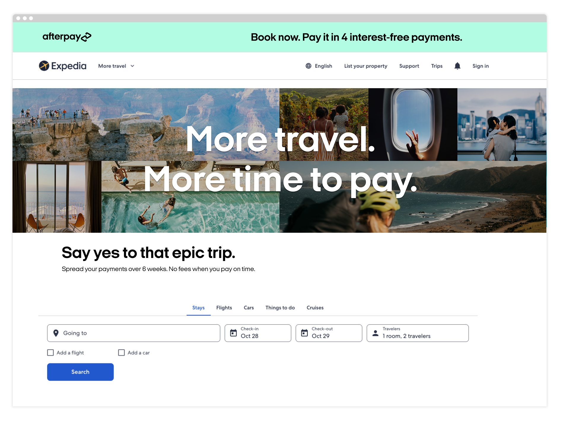 In November 2022, Afterpay and Expedia announced a landmark collaboration. Afterpay’s buy now, pay later budget flexibility combined with Expedia’s global supply of more than three million properties and 500+ airlines, just in time for holiday travel. I designed this experience page, where visitors can easily book their flights and hotels and check out with Afterpay’s installment payments. I also designed social assets and Afterpay’s emails announcing and promoting the new page, all with a strong emphasis on elevated imagery.
